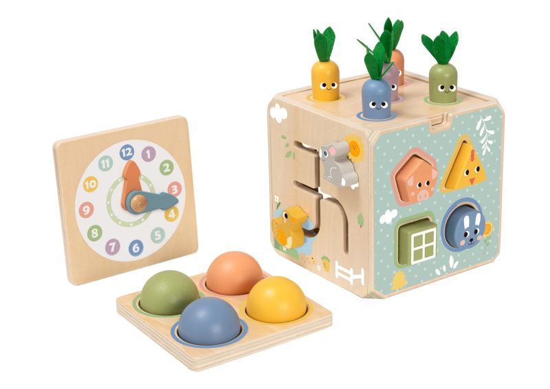 includes a range of hands-on features designed for early learning and play. Each facepresents a different activity, including shape sorting, sliding animal tracks, rotating gears, a simple clock dial, and a removable pounding board with coloured balls. The top section features soft felt-topped carrot pieces that can be pushed and pulled, adding a tactile element.
