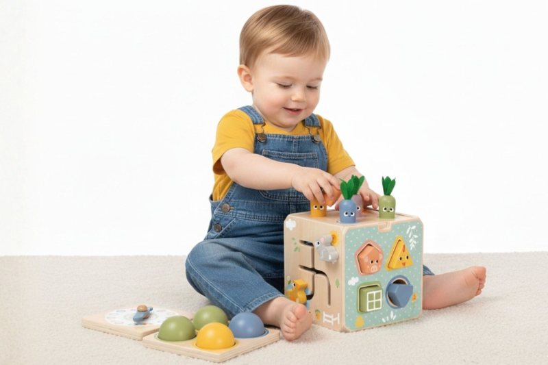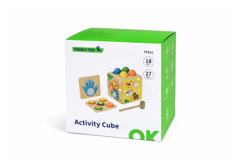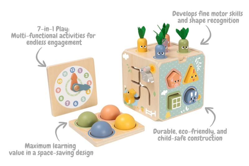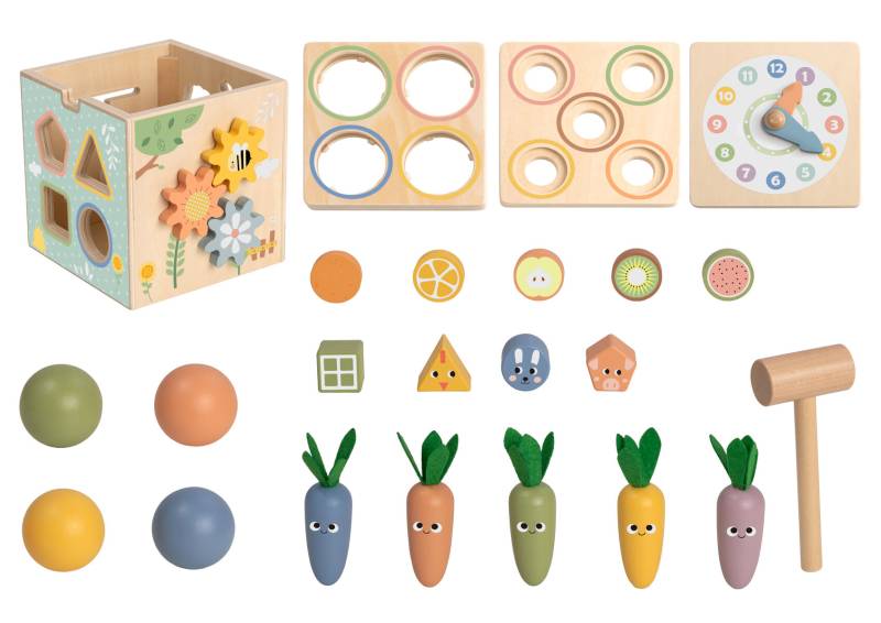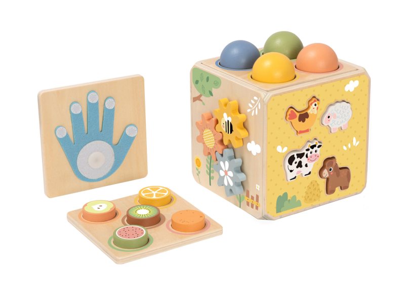 The cube is compact and structured to keep all parts together, with removable panels that store neatly inside. Activities support hand-eye coordination, fine motor control, and basic shape and colour recognition. The set includes multiple wooden pieces and a small hammer, with smooth edges and a stable design suitable for young children.