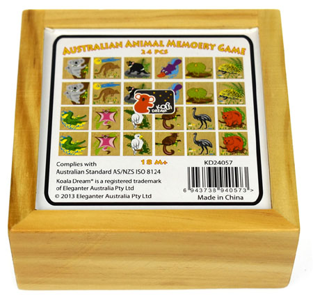 is a 24 tile set presented in a sturdy wooden box with sliding lid. This wooden game comes with 24 pieces with a total of 12 Australian animals printed on separate wooden tiles. There are two of each animal so you can try to match them up. The animals are