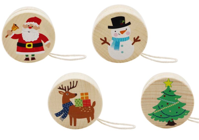 This set of four wooden yoyos features cheerful Christmas designs — Santa, Snowman, Reindeer, and Christmas Tree. Each yoyo is smooth to the touch and easy to grip, making it suitable for children to learn and enjoy simple yoyo tricks. The printed illustrations are bright and festive, adding a seasonal touch to playtime or party gift bags.