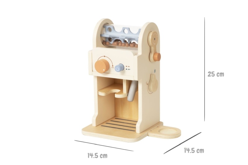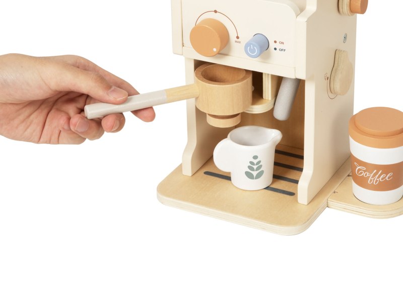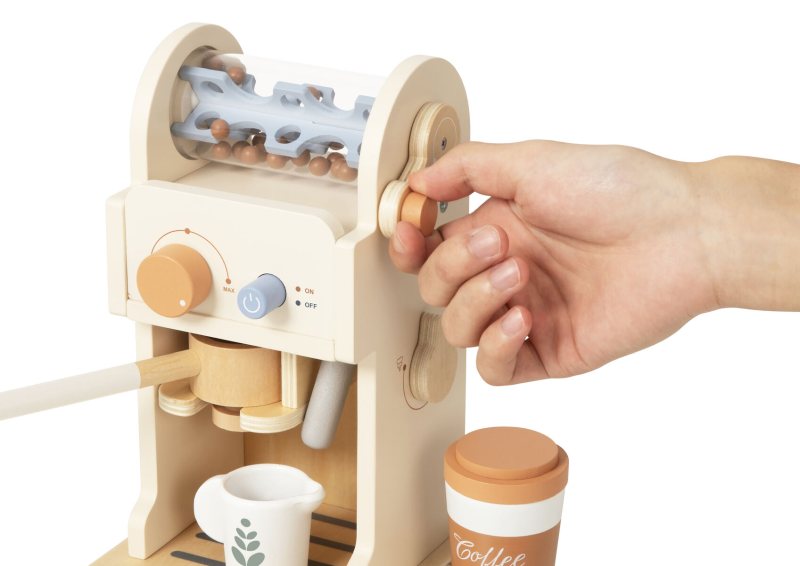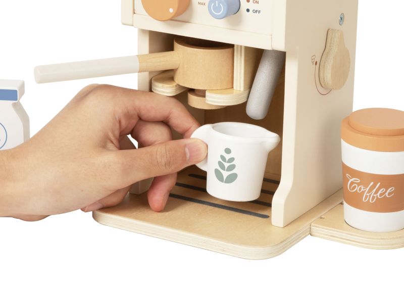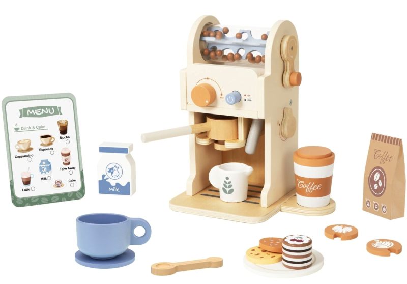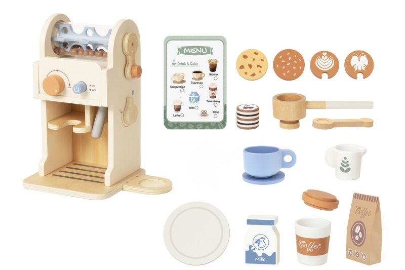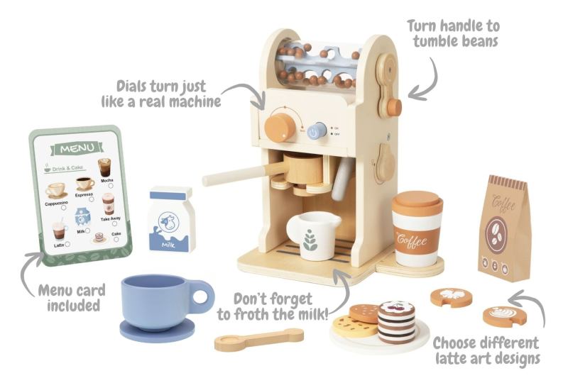 This wooden coffee machine playset includes a play espresso machine with turning dials, a removable portafilter, cups, milk carton, and coffee accessories. The set also features interchangeable latte art discs and a menu card for pretend cafe play.