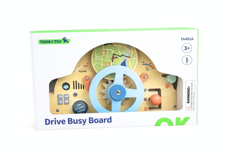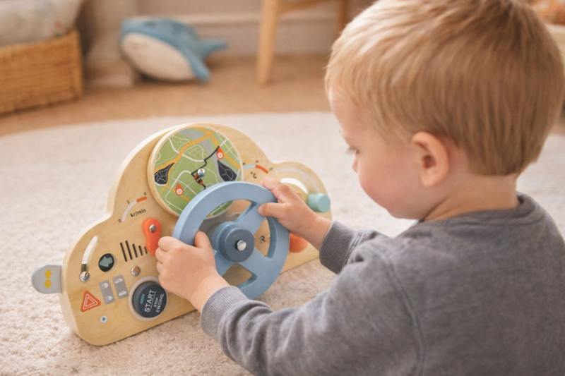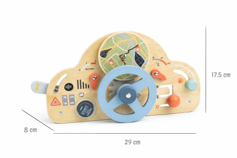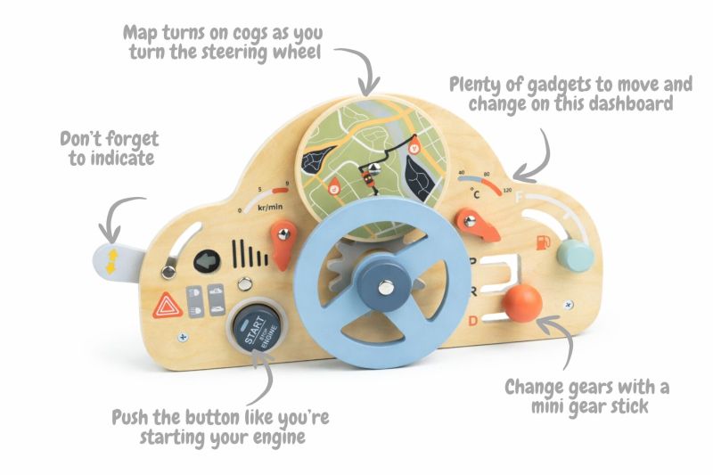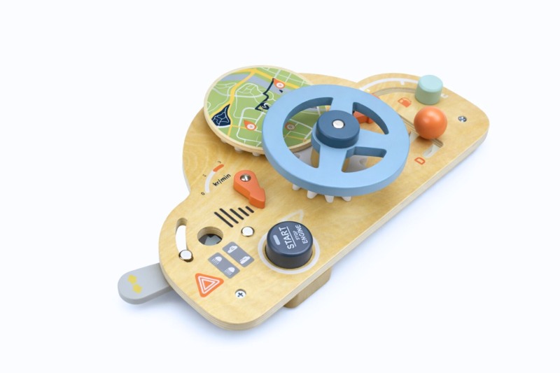 This wooden drive busy board is designed like a vehicle dashboard, featuring a steering wheel connected to moving gears, a sliding gear stick, switches, dials, and interactive elements. Turning the wheel rotates internal cogs, while other controls can be pushed, slid, or turned to create movement and response.