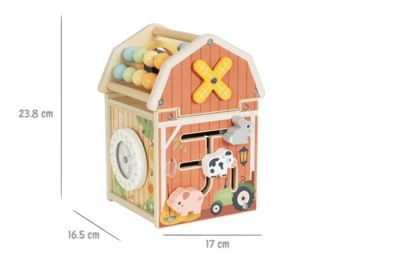 This farm themed activity playhouse combines multiple hands-on features in one compact design. Each side offers a different activity including a bead frame, spinning wheel, animal maze, shape sorting and a ball drop feature. The pieces are fixed or contained within the unit, making it suitable for repeated use without loose parts.
