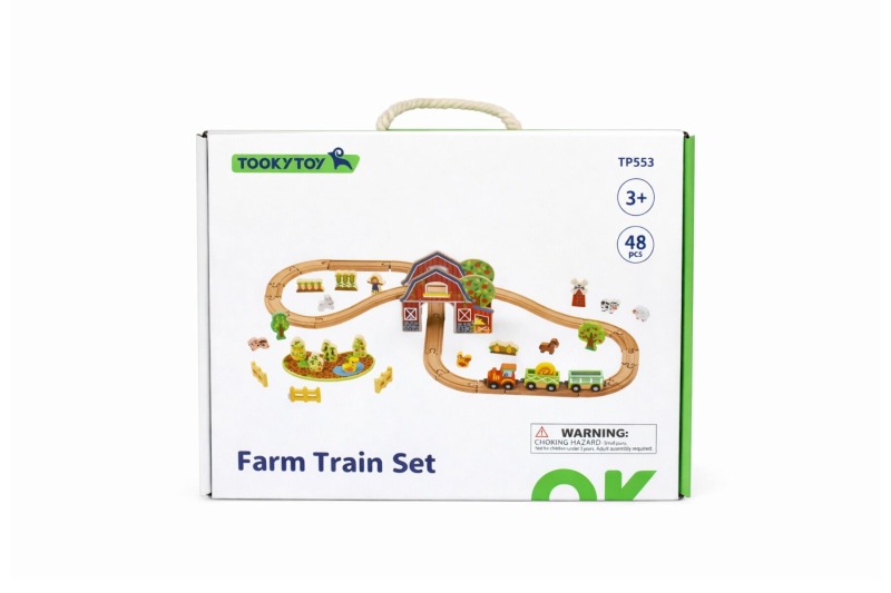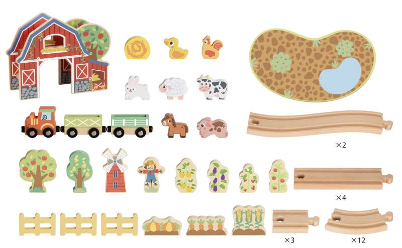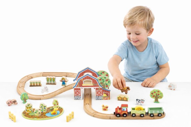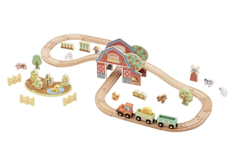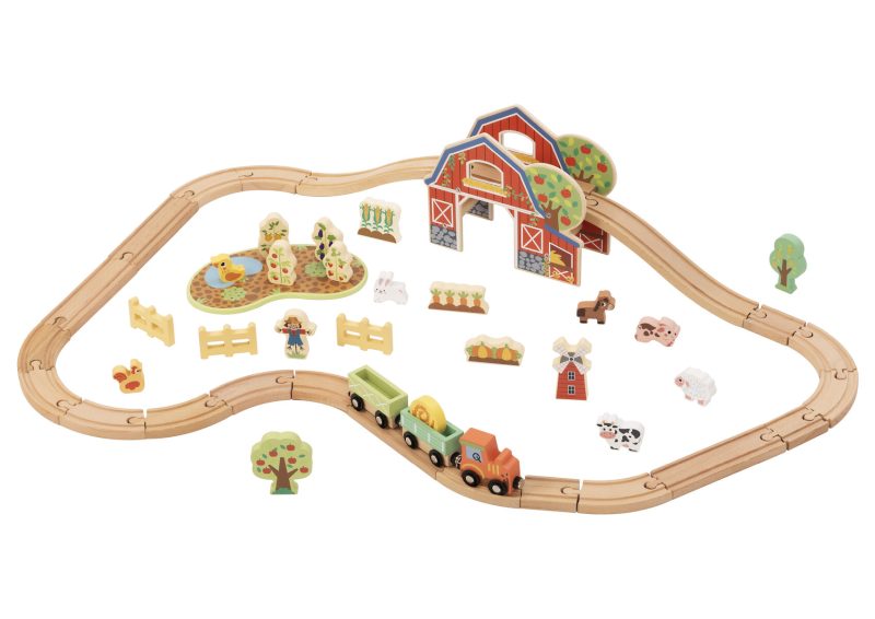 The set supports imaginative play by allowing children to arrange the layout and position the farm pieces in different ways. It also assists with coordination and problem-solving through connecting track sections and moving the train along the route. The track is compatible with most leading wooden train systems.