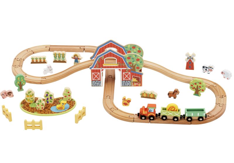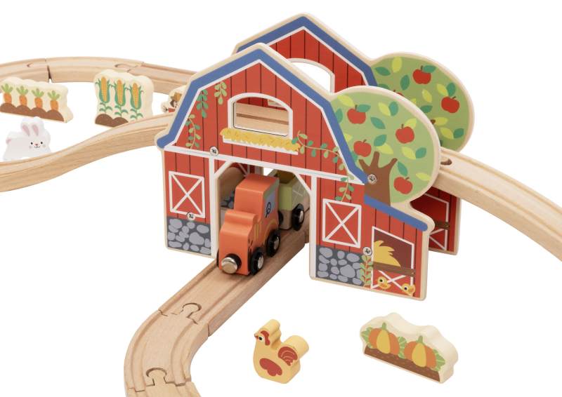 This farm-themed train set includes a wooden track layout with a barn, tractor with carriages, and a range of farm pieces such as animals, trees, crops, fencing, and scenery. The track forms a continuous loop with a central barn tunnel, allowing the train to pass through while interacting with the surrounding elements.