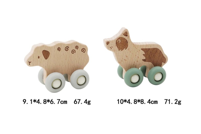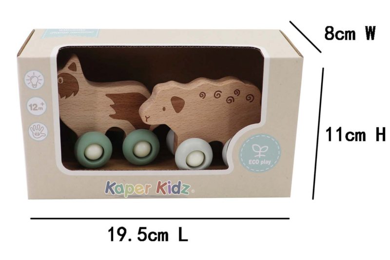 The Farm Wheels Sheep and Dog set brings classic farmyard friends to life in a playful and eco-friendly way. Made from solid wood with smooth, rounded edges, each animal features engraved details. The soft silicone wheels roll easily across different surfaces, making these toys safe for indoor play and perfect for little hands to push along.