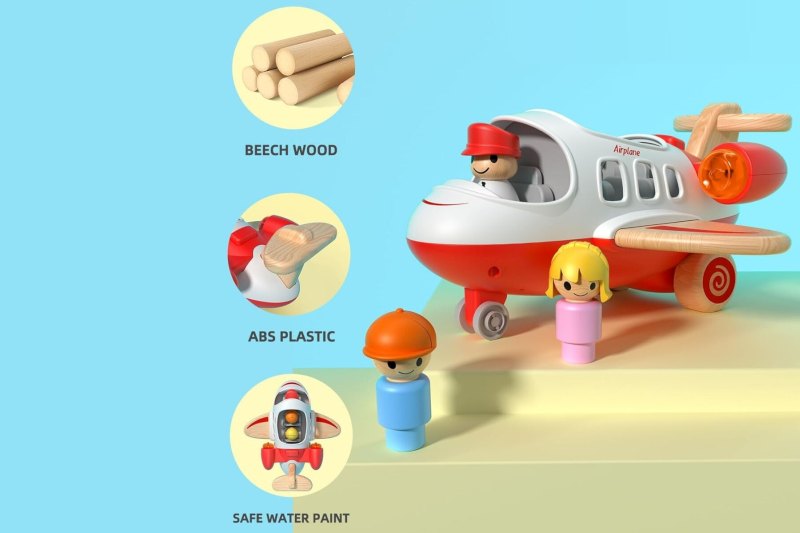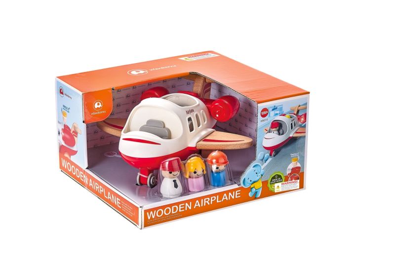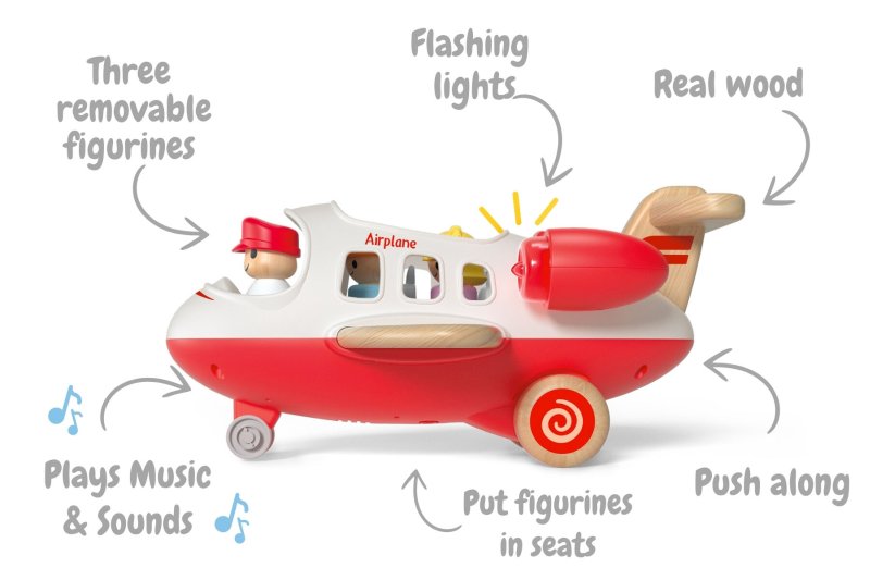 Prepare for thrilling sky-high adventures with the Light Sound Wood and Plastic Red Airplane from Wanborns. With the press of a button, this bold red aircraft comes alive—flashing bright lights and playing an upbeat melody along with realistic airplane sounds. A wooden pilot and two ready-to-fly passengers are included, making each trip across the room or through imaginary clouds a mission full of excitement.