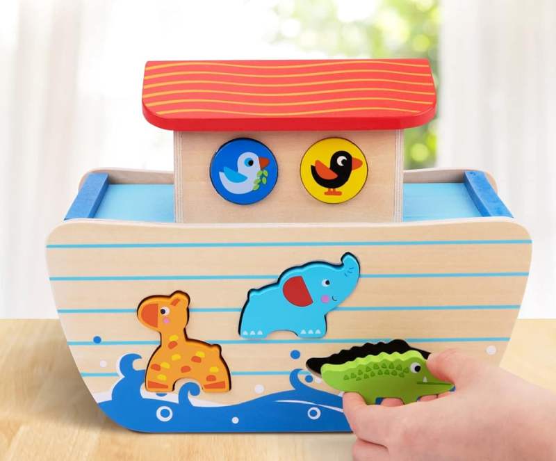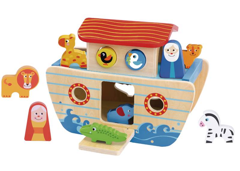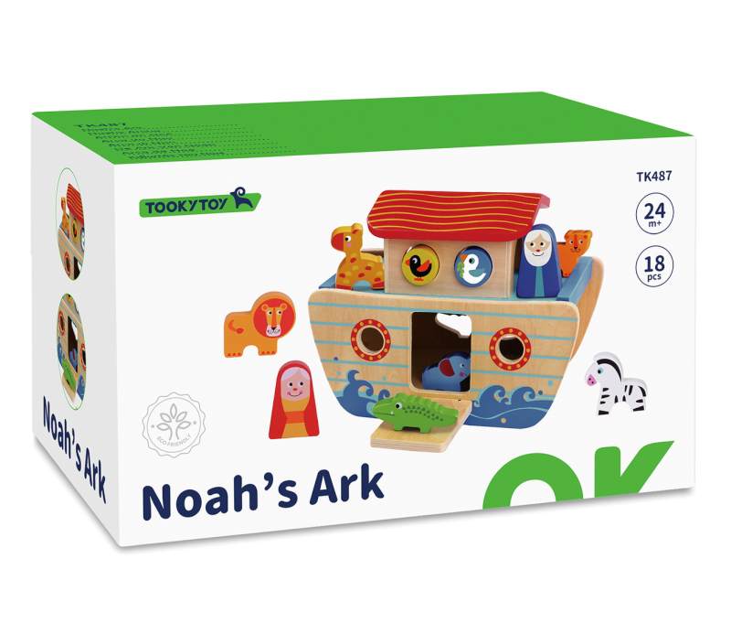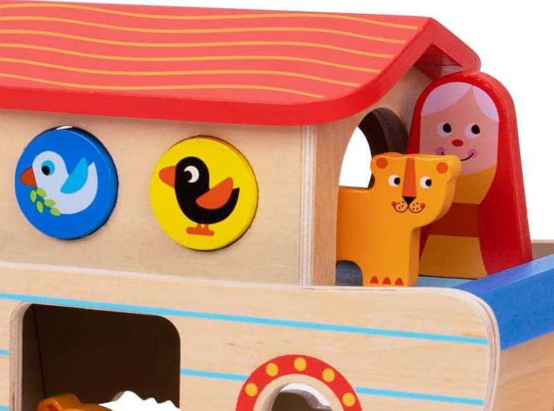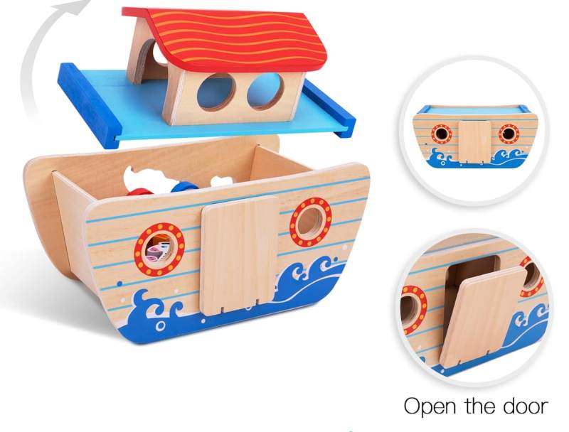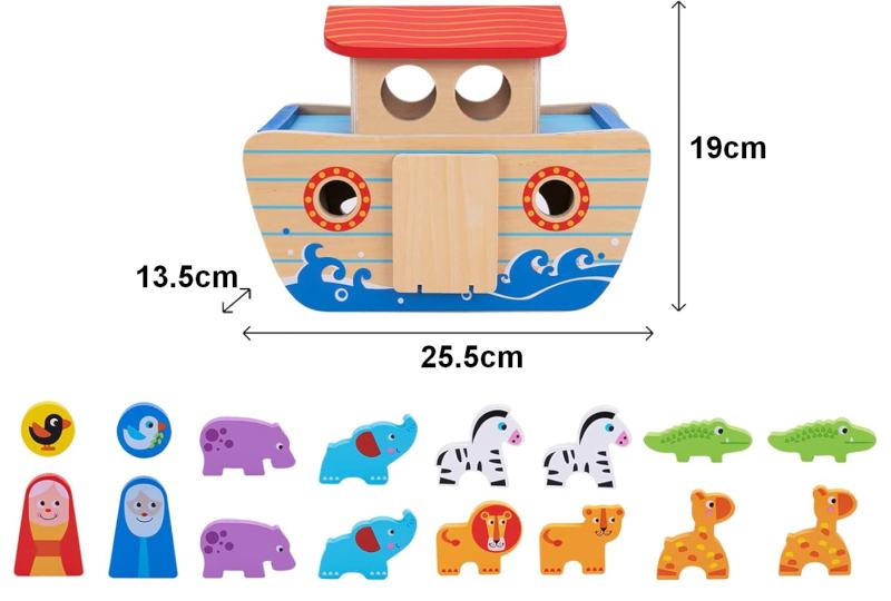 But the excitement doesn't stop there! Our Noah's Ark playset also doubles as a shape sorter, adding an educational twist to playtime. The wooden ark boat features three animal-shaped cut-outs, allowing only the corresponding animals to fit through those holes. Other animals can find their way inside through the ark's door by climbing up the drop down ramp on the opposite side. When playtime is over, tidying up is easy. Simply gather all the animal blocks and store them neatly inside the ark. To maximize space and keep the playset organized, flip the top of the ark upside down and place it inside the hull of the boat. Delight your little one with this engaging and educational toy that sparks creativity and fosters cognitive development.