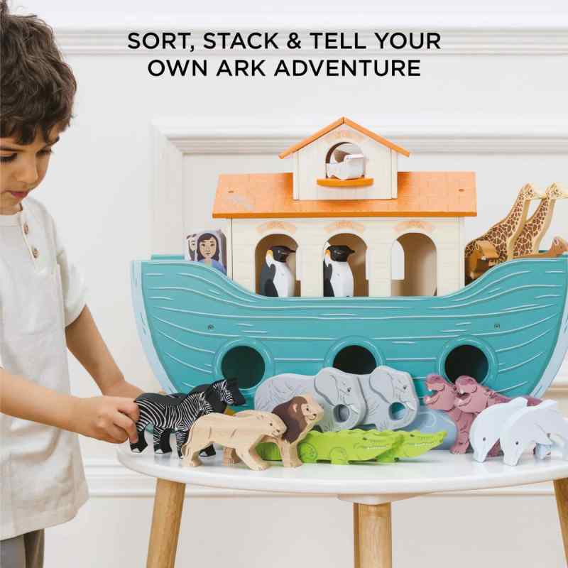 The structure supports interactive play with accessible openings and internal space for positioning figures. Children can match animals in pairs, organise them on different levels, and move them in and out of the ark using the entry points. The set is designed for repeated use with durable materials and a stable base.