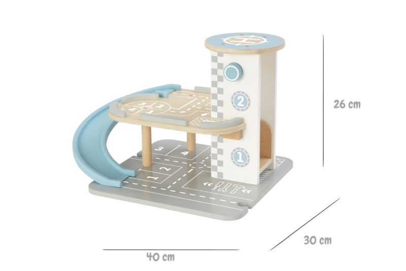 The Parking Garage is a compact multi-level wooden playset measuring approximately 40 cm × 30 cm × 26 cm. It includes two parking levels, a working lift operated by a side crank, and a curved ramp that allows vehicles to move between floors. The top platform features a marked helipad, and the base includes printed road markings for simple driving and positioning play.