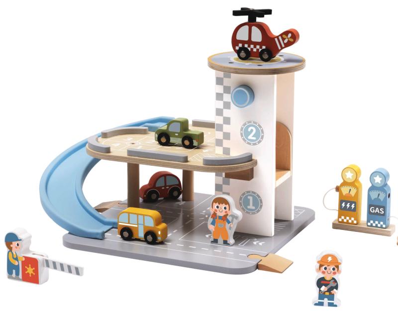 The set comes with four wooden vehicles, a helicopter, three character pieces, a boom gate, and two refuelling units—one petrol bowser and one electric charger. Children can raise and lower the lift, drive vehicles up and down the ramp, and use the accessories to create basic role-play scenes. This playset supports fine motor skills, hand-eye coordination, and early sequencing as children move vehicles and figures around the structure.