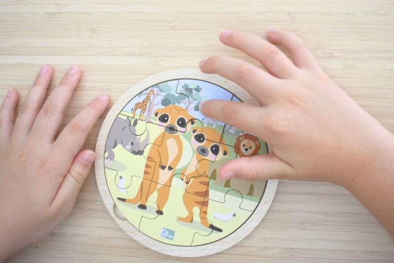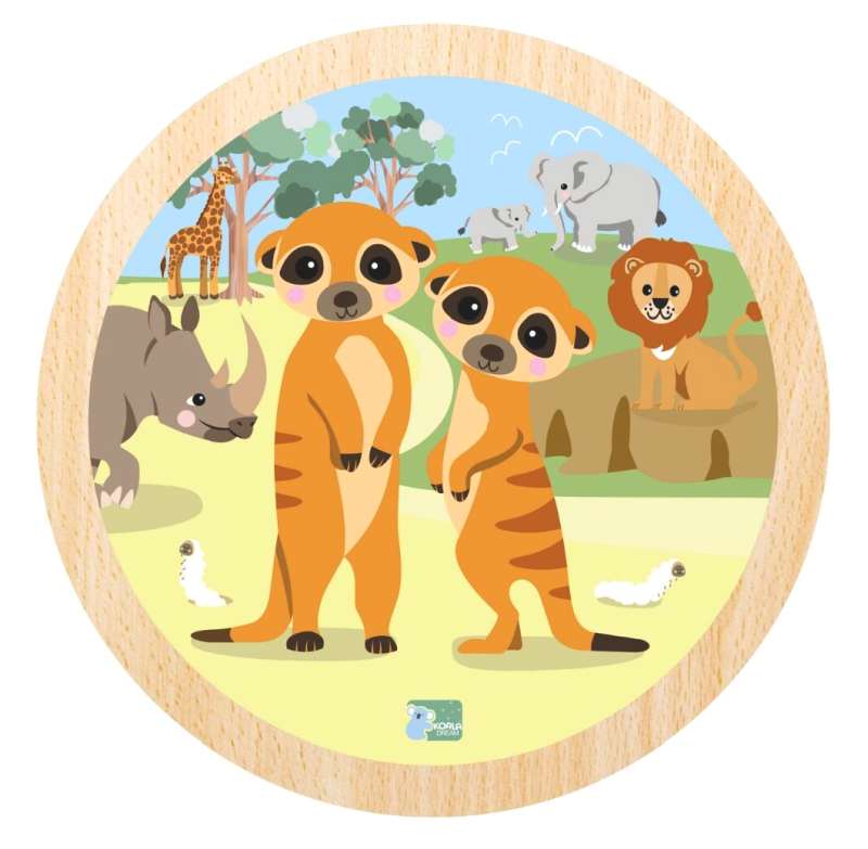 This round 9 piece wooden jigsaw puzzle features two friendly meerkats standing together in a bright savannah scene, surrounded by familiar animals and simple background details. The bold illustration and limited number of pieces make it suitable for young children beginning puzzle play.