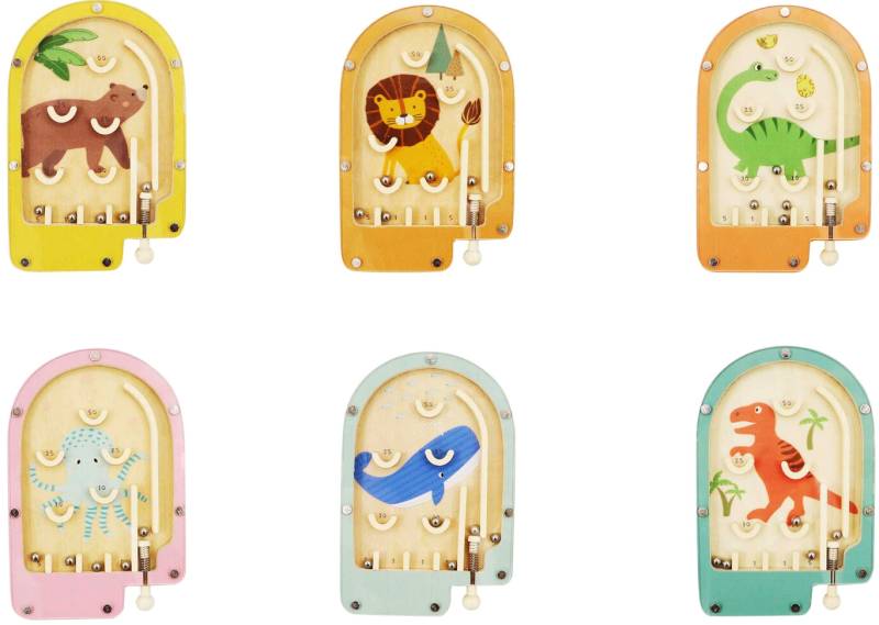 This set includes six wooden pinball games featuring different animal designs such as a dinosaur, bear, whale, octopus, lion, and more. Each handheld game has a spring-loaded plunger to launch metal balls into scoring zones, with clear covers and printed backgrounds. The wooden frame provides a solid feel, and the compact size makes them easy to hold and play.