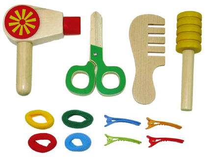 This set has scissors, brush, comb and hair dryer.