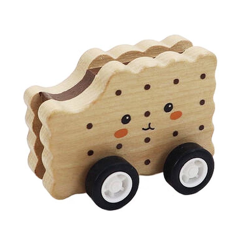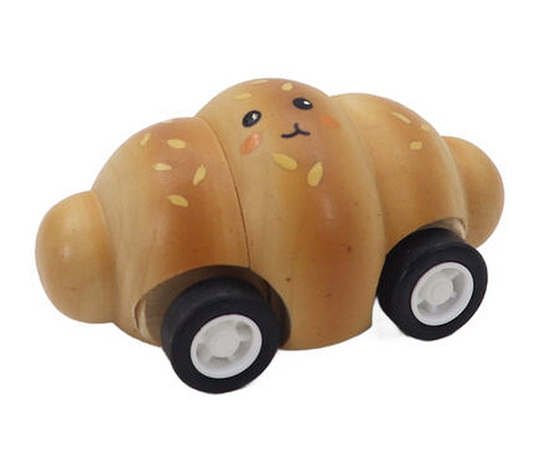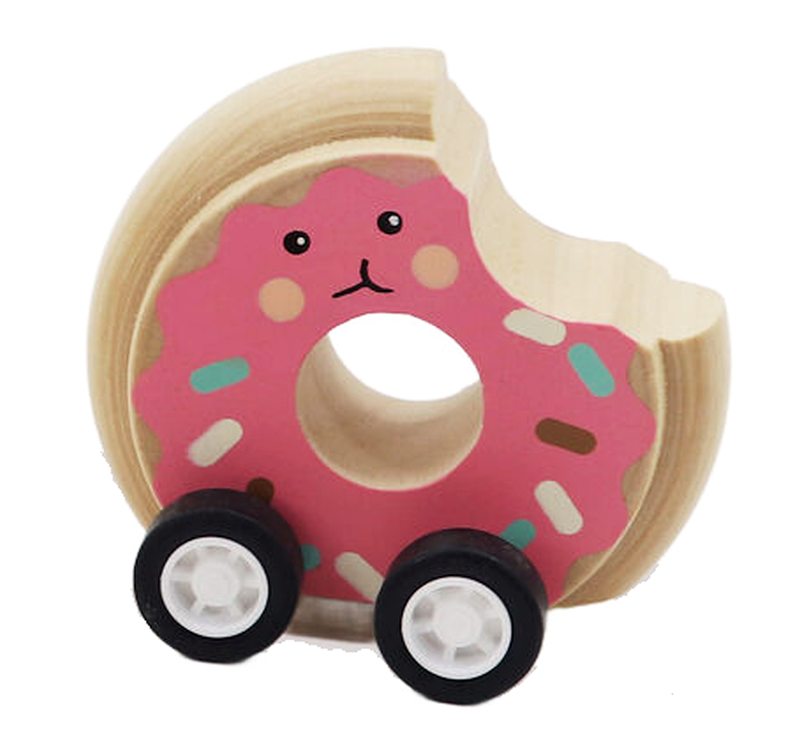 This set includes three pull back vehicles designed as pastry items, featuring a donut, croissant, and biscuit. Each piece uses a simple clockwork pull back mechanism. Pull the toy backwards and release to move it forward across smooth surfaces. The wooden bodies are shaped and painted to represent each pastry design.