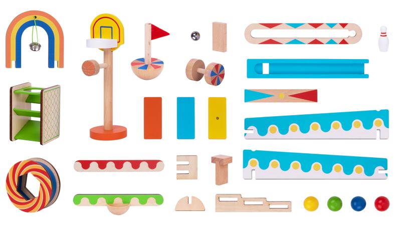 The toy encourages repeated experimentation. Assemble a layout, test it, then adjust pieces or add more to change the outcome. The open ended process helps kids learn by trial, repositioning parts until everything works, which makes success feel more satisfying. Pieces are solid wood with child‑safe paint, plus metal and marbles, sized for hands‑on play and quick resets for the next attempt.