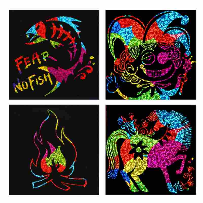 Scratch art is fun technique. Concealed beneath a layer of black matte material is a dazzling and glittery palette. Using a wooden stylus, artists delicately scratch away the top layer, revealing bursts of color and a touch of glitter. This dynamic interplay between darkness and radiance invites creators to explore and express their imagination, turning each scratch into a magical mark.