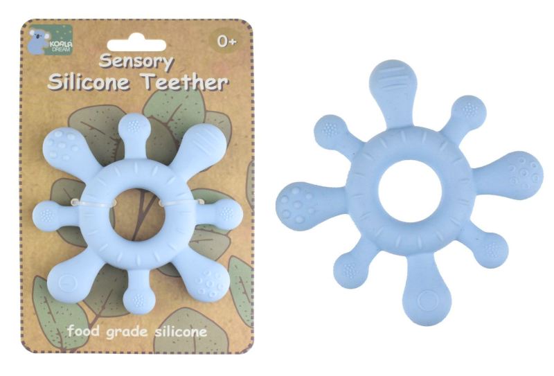 Crafted from safe silicone and boasting a captivating blue hue, it provides a secure surface for little hands to grasp, ensuring a tactile and delightful teething journey. Let the calming waves of our unique teether wash away discomfort, bringing joy and relief to your baby's exploration of textures during this important developmental phase.