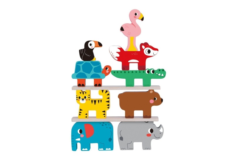 This set includes a collection of brightly coloured animal-shaped blocks and 2 rectangle boards that can be stacked, balanced, and arranged in creative ways. The set features a variety of animals including an elephant, rhinoceros, tiger, fox, toucan, flamingo, crocodile, deer, hedgehog, and turtle. Each block is smooth, lightweight, and easy for small hands to hold, encouraging fine motor skills, hand-eye coordination, and problem-solving as children experiment with balance and construction.
