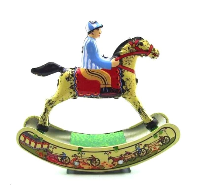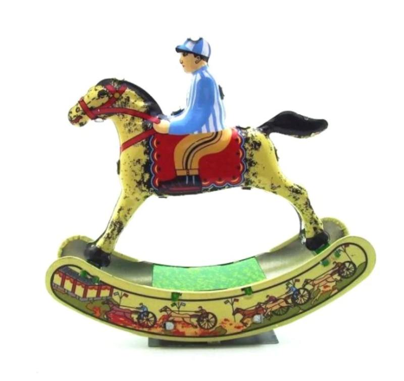 Brings timeless joy with its classic design and playful functionality. Featuring a jockey figure riding a beautifully printed tin horse, this toy captures the essence of childhood playfulness and imagination. Wind the base, and watch as the horse gracefully rocks back and forth, creating a delightful motion that reminds you of a horse galloping.