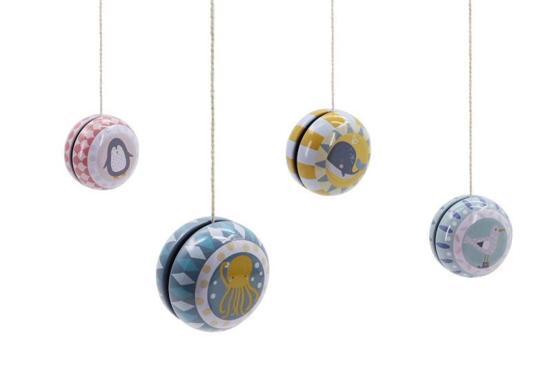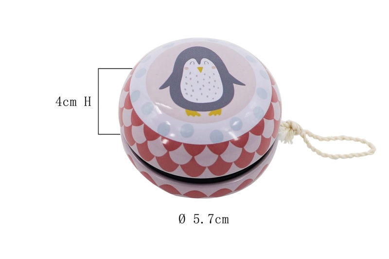 This set of four tin yoyos features ocean themed designs including a penguin, whale, octopus, and seagull. Each yoyo measures approximately 5.7 cm in diameter and 4 cm high, with a strong string ready for classic up-and-down fun. The smooth tin finish and bright patterns make these yoyos easy to handle and appealing to children and adults alike.