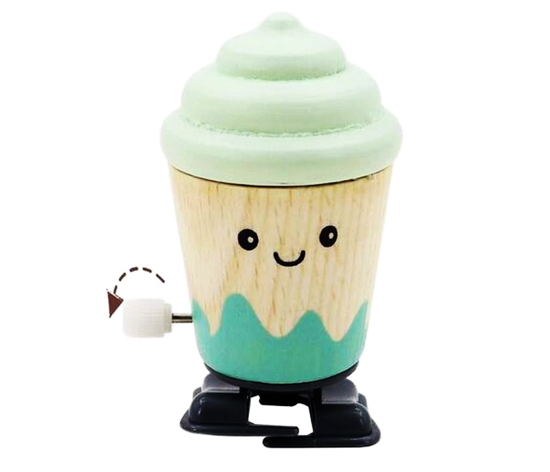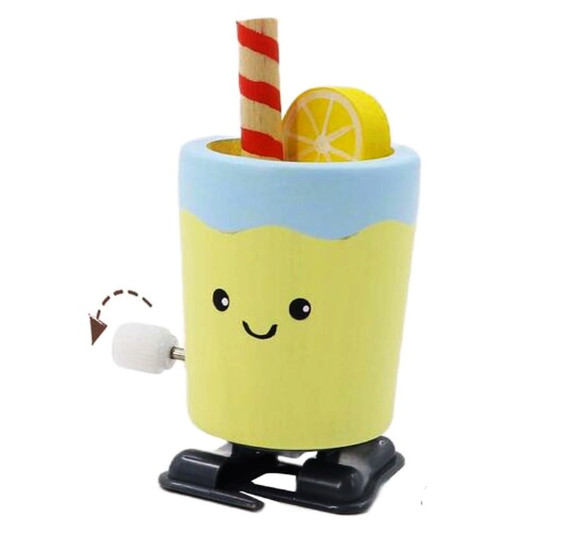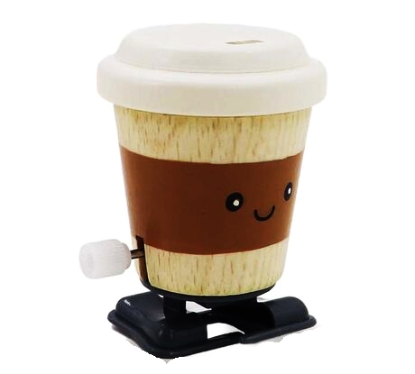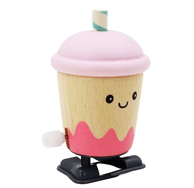 This set includes four wind up toys designed as takeaway-style drinks, featuring a coffee cup, smoothie cup, iced drink, and milkshake style cup. Each piece uses a clockwork mechanism, turn the side key to wind the internal spring, then place the toy on a flat surface to produce a walking motion.