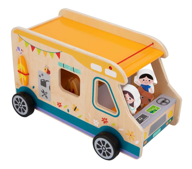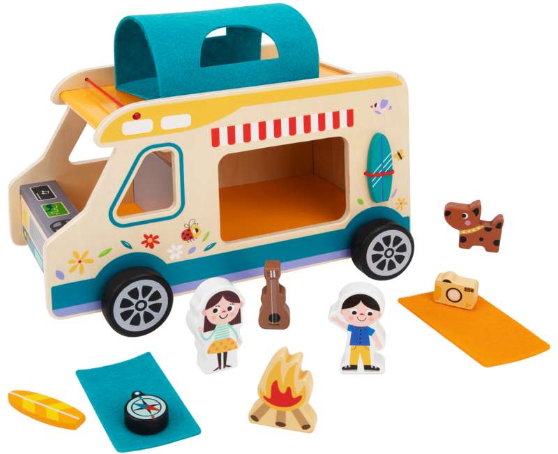 is a 13-piece playset designed for pretend road-trip camping adventures. The wooden camper van features rolling wheels, an open interior, and elastic straps on the roof and side to secure accessories while travelling.