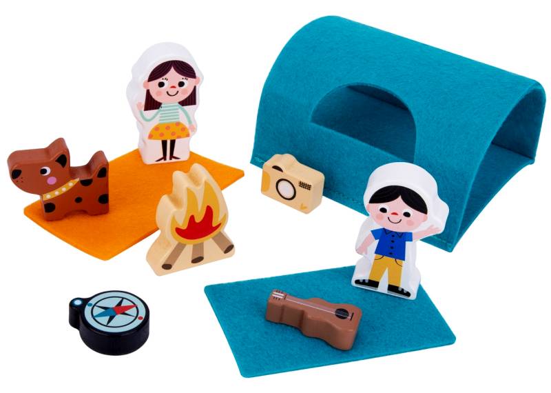 This playset includes a wooden camper van, two felt mats with a sleep-out tent, two wooden figures (man and woman), a wooden dog, campfire, camera, guitar and compass, and two wooden surfboards. There is plenty of space inside the van to store the campsite pieces, making it easy to pack everything away before heading off to the next destination. The surfboards are held to the side of the van with elastic loops, with an additional elastic strap on the roof to keep items in place during play.