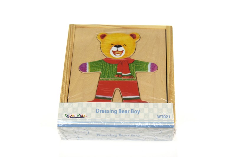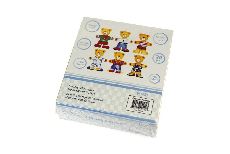A classic wooden puzzle with 18 pieces in a wooden storage box which can be mixed and matched to create different outfits, expressions and moods for the boy bear. This deceptively simple dress-up puzzle has 216 different combinations and you can have fun swapping the bears head, changing his expression and his body and legs which alter his clothes and shoe choice.
